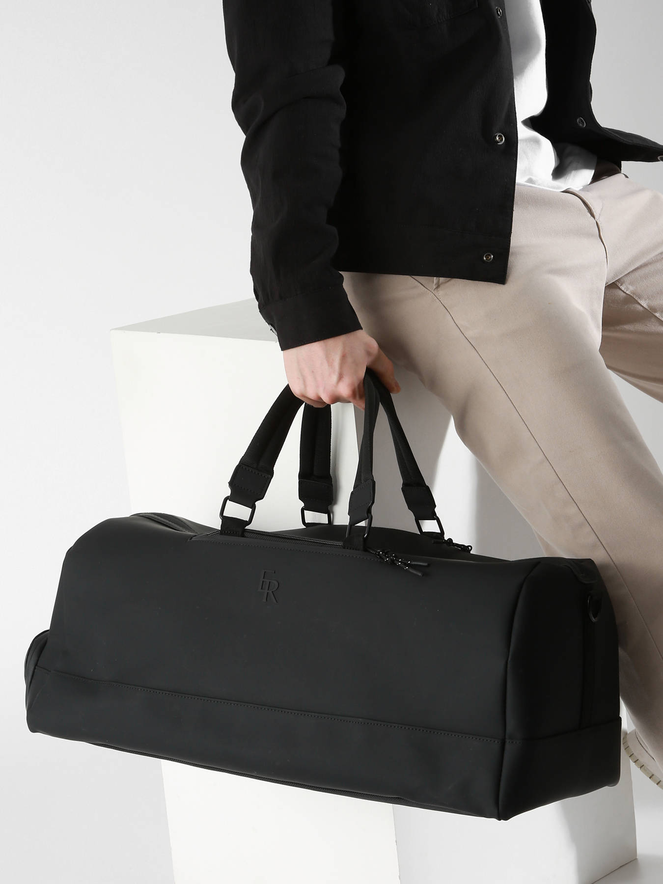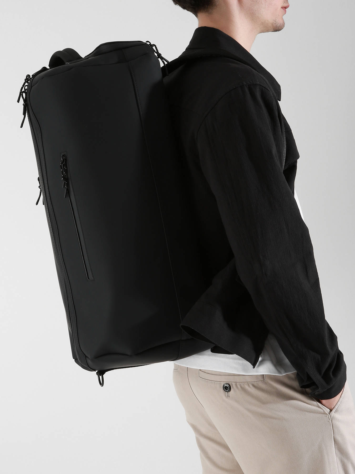 This cabin travel backpack from the Impulsion line, made of waterproof polyurethane, combines practicality and elegance. It can be worn as a backpack thanks to the stowable straps at the bottom, while the handles are conveniently stored in the side pockets. It also features a shoe pocket and a padded compartment for a 13-inch laptop. The embossed tone-on-tone logo on the front adds a subtle, refined touch.