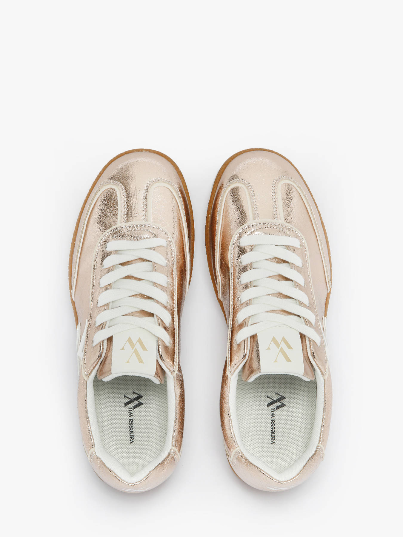 Fall for the Sarah monogram sneakers by Vanessa Wu, a perfect blend of retro style and modern comfort. Made in gold textured faux leather or dark camel split suede with a white monogram, they add elegance and originality to any outfit. Available in camel or gold, they suit every look. The removable microbead insole and slim stitched retro camel sole provide all-day comfort, support and lightness. This model fits true to size, take your usual size or go up for half sizes. Perfect for a chic yet casual style, these sneakers are a must-have from Vanessa Wu’s collection.